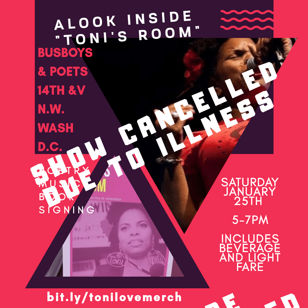 My sincere apologies but the DC Book Launch of Toni’s Room has been postponed. Toni is sick with the flu and is unable to perform this Saturday.