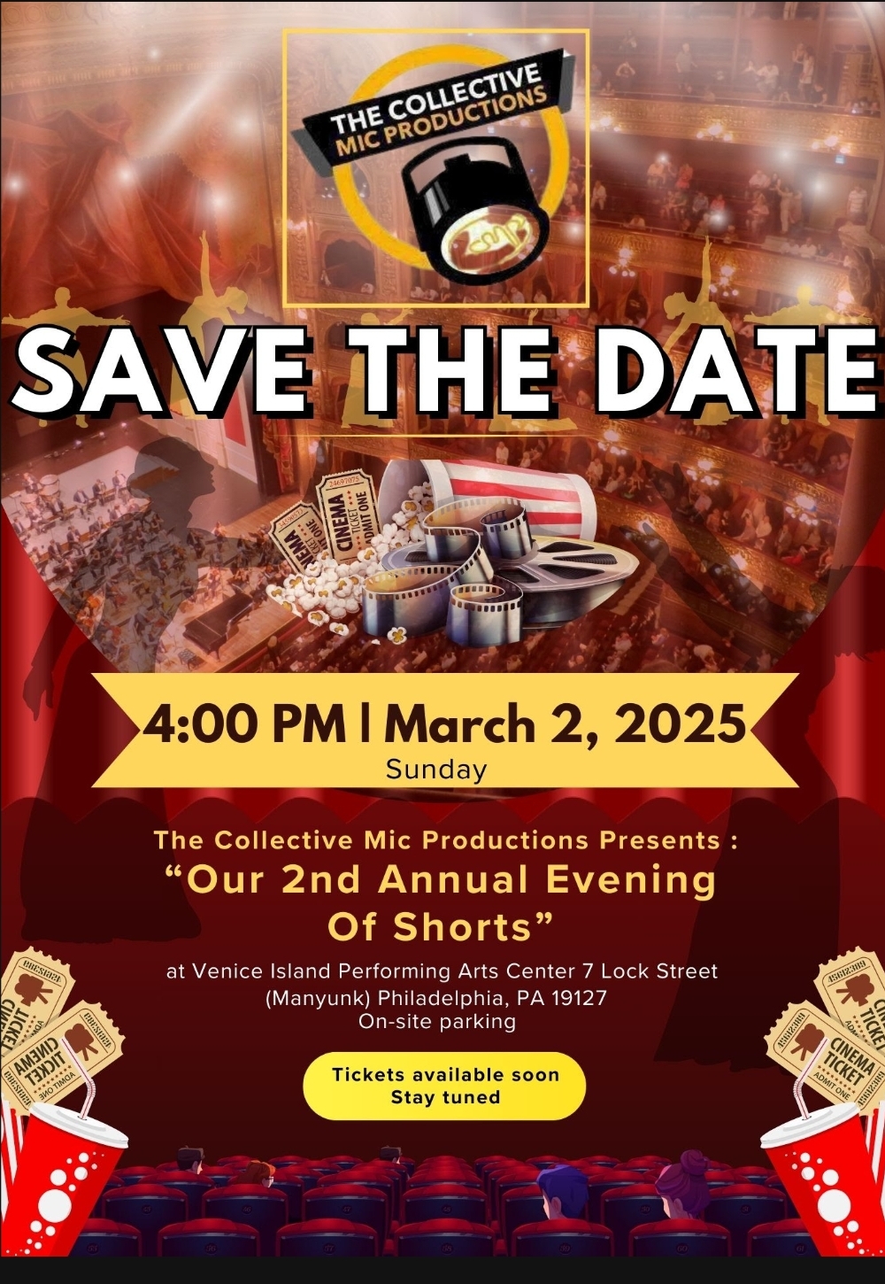 We want to let you know about March 2, 2025, at 4 PM. The Collective Mic Productions will host our 2nd Annual “An Evening of Shorts” at the Venice Island Performing Arts Center, located at 7 Lock Street, Philadelphia, PA 19127 (Manayunk). There’s PPA Kiosk parking available on site.