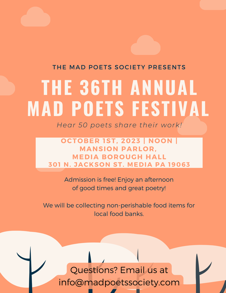 The Mad Poets Festival is coming up this weekend! Come out on October 1st between noon and 5 to get your poetic fix, meet some fabulous poets, and even pick up a book or two. Don’t forget to bring your canned goods – we will be collecting non-perishable food items for the Chester County Food Bank at the event.