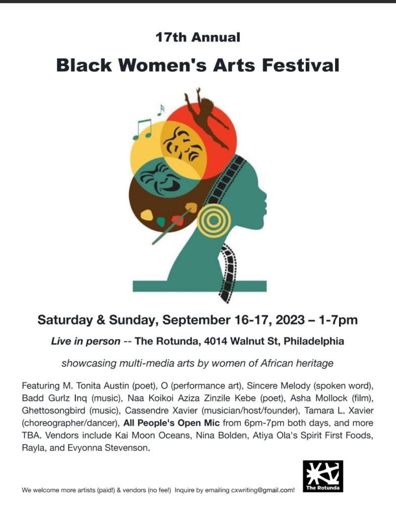 The Black Women’s Arts Festival continues TODAY (Sept 17th) #supportlocalartists 1-7PM at the #Rotunda 4014 Walnut Street in #Philly! It’s #FREE. Check out the website for the schedule. I’m on at 3:20PM. HOPE TO SEE YOU THERE ❤️ https://cassendrexavier.wordpress.com/